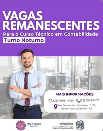 O CEET Emílio Nemer informa que ainda há vagas remanescentes para o Curso Técnico em Contabilidade – turno noturno. Essa é a sua oportunidade de se qualificar na área administrativa e financeira, ampliando suas chances no mercado de trabalho e construindo um futuro com mais oportunidades. Mas atenção: as vagas são limitadas! Garanta já a sua vaga e invista no seu crescimento profissional. Mais informações: WhatsApp: (28) 99981-0118 e Telefone fixo: (28) 3542-5417.
